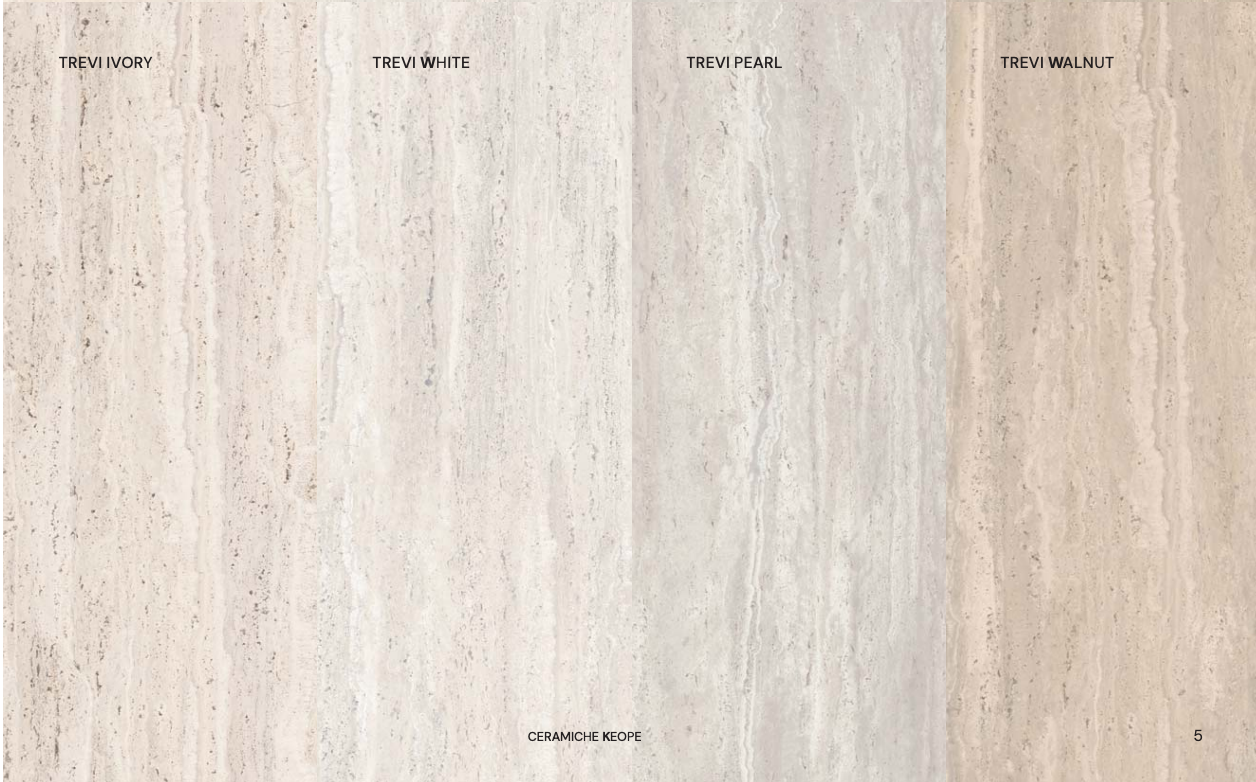 The color palette reflects a gradual interplay of light, transitioning from sand to ivory, from pearl to pure white – a luminous spectrum inspired by the natural elements of air, water, earth and fire. Shades that exude a natural, exclusive and modern aura. In Trevi, delicate arabesque veins create ethereal and sophisticated atmospheres. The Trevi Cross proposal stands out for its flap cut, which gives surfaces remarkable compactness and a delicate, whisper-like cloudy effect that exudes grace. A subtle dynamism, shaped by light and different colors.